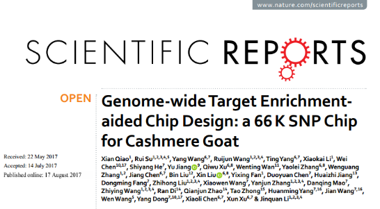 2017年8月17日,由我校农业部肉羊遗传育种重点实验室、内蒙古自治区动物遗传育种与繁殖重点实验室、内蒙古自治区山羊遗传育种工程技术研究中心、动物科学学院李金泉教授研究团队联合中国科学院昆明动物研究所、华大基因研究院共同完成的科研论文“Genome-wide Target Enrichment-aided Chip Design: a 66K SNP Chip for Cashmere Goat”(“基于全基因组捕获测序策略设计绒山羊66KSNP芯片”),在Nature旗下的《Scientific Reports》期刊发表。其中我校动科院博士研究生乔贤,教师苏蕊、王瑞军为论文共同第一作者,李金泉教授为通讯作者。该研究主要由李金泉教授主持的国家高技术研究发展计划“863”计划(2013AA102506)、国家绒毛用羊现代农业产业技术体系(CARS-40-05)等项目资助。